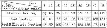 | 以上实验条件:室温25℃,电耗48度/小时、油耗4.935升/小时。 1.3 转换不同的加热方式,仍能保证烘道内工作温度均匀度误差≤10℃。 |